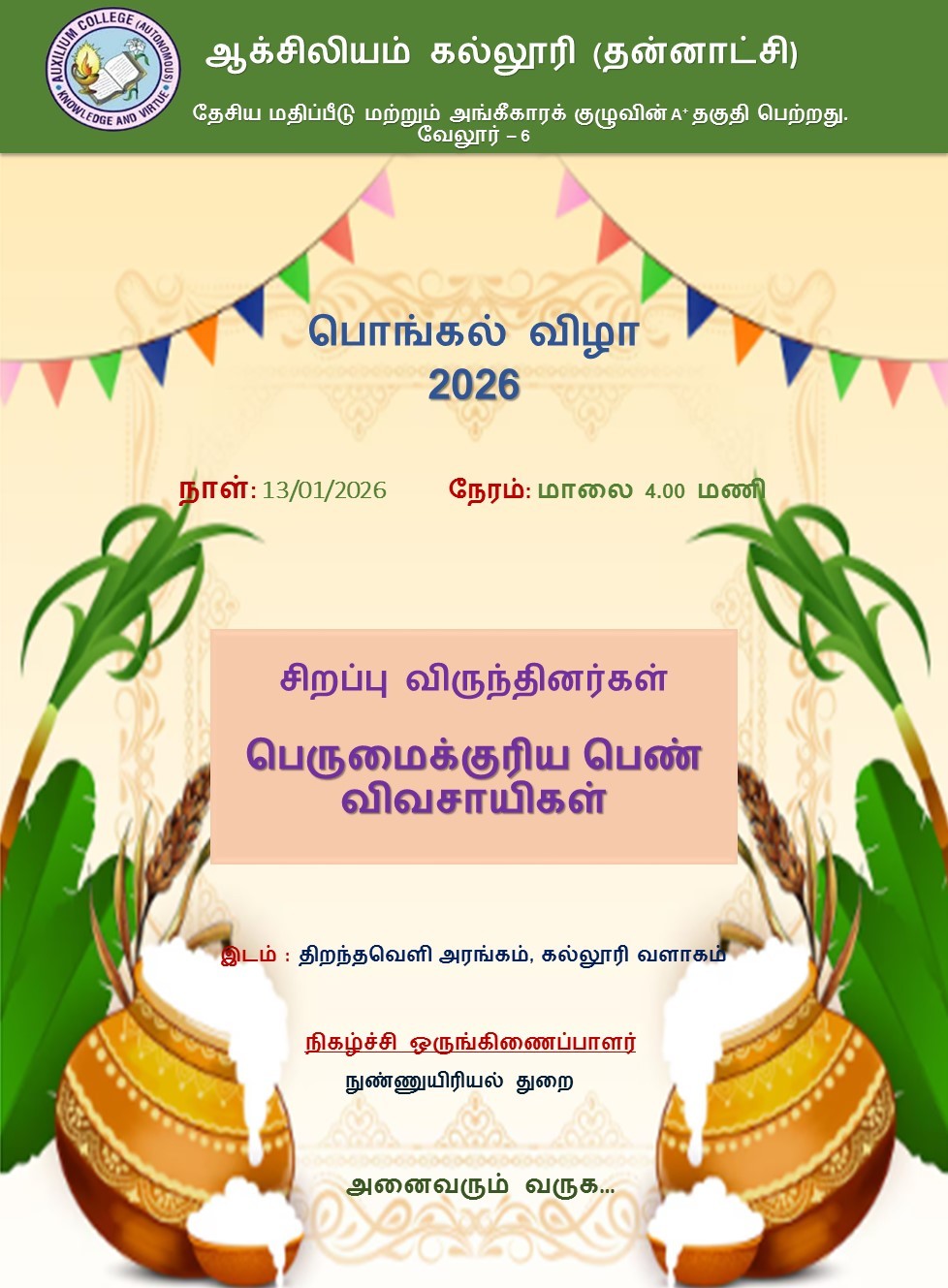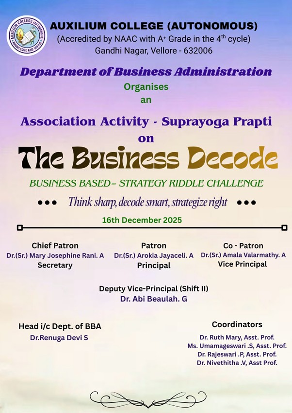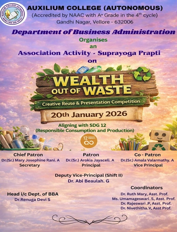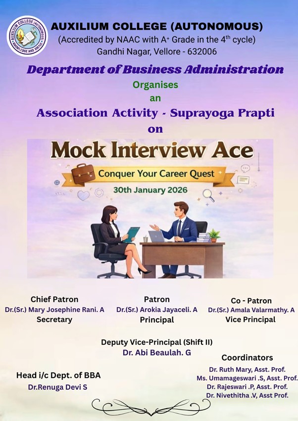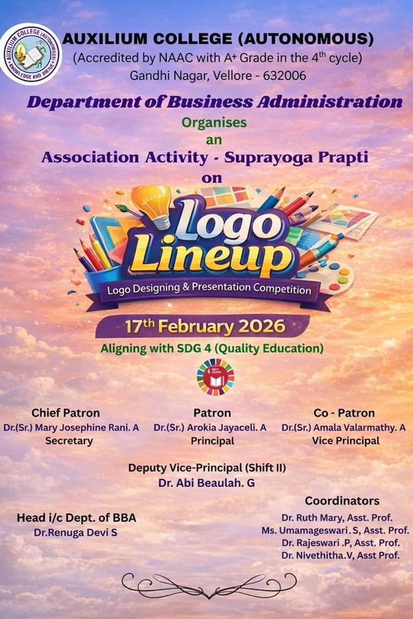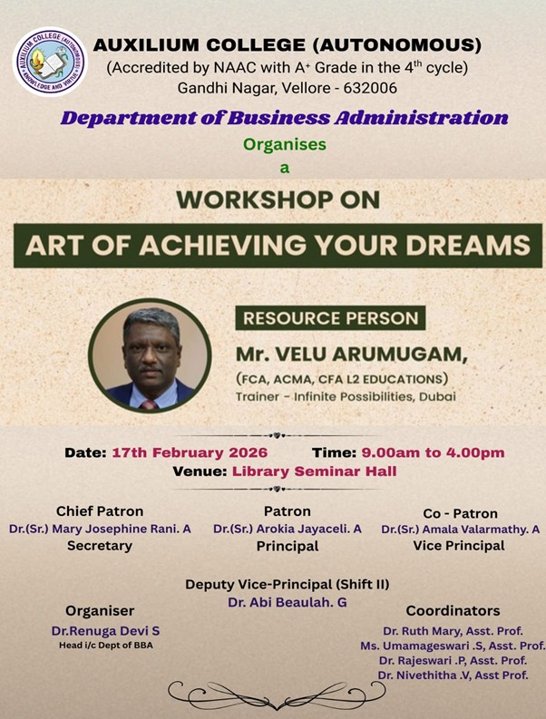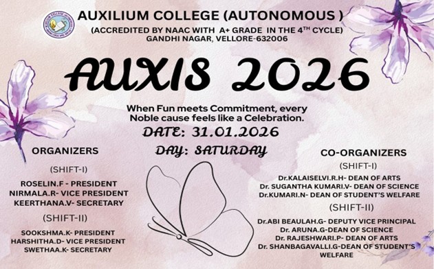 Auxilium College founded in 1954 is the first women’s College in the Vellore district and is affiliated to the Thiruvalluvar University. Auxilium has been granted the status of autonomy by the UGC and the Thiruvalluvar University from the academic year 2007-2008. The College has been accredited by National Assessment and Accreditation Council (NAAC) with A+ grade in 2003, Re-Accredited with a grade with A CGPA of 3.41 out of 4 in 2010 and with A+ grade with a CGPA of 3.55 out of 4 grade in the 3rd cycle in 2016. The College is currently holding as A+ with a CGPA of 3.47 out of 4 in the 4th cycle of Assessment and Accreditation in May 2024. It is a minority institution established and administered by the Daughters of Mary Help of Christians, commonly known as Salesian Sisters of Don Bosco, belonging to the Catholic Church. It is primarily meant for the higher education of deserving Catholics but members of other communities are also admitted without reference to caste or creed and their rights of conscience are respected.